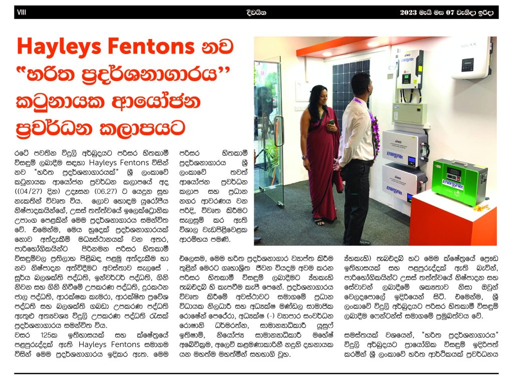 රටේ පවතින විදුලි අර්බුදයට පරිසර හිතකාමී විසඳුම් ලබාදීම සඳහා Hayleys Fentons විසින් නව “හරිත ප්රදර්ශනාගාරයක්” පසුගිය බ්රහස්පතින්දා (4/27) දින උදෑසන 06.27 ට යෙදුන සුභ නැකතින් කටුනායක ආයෝජන ප්රවර්ධන කලාපයේ විවෘත විය. ලොව හොඳම යුරෝපීය නිෂ්පාදකයින්ගේ, උසස් තත්ත්වයේ ඉලෙක්ට්රොනික උපාංග පෙළකින් මෙම ප්රදර්ශනාගාරය සමන්විත වේ. එමෙන්ම, මෙය හුදෙක් ප්රදර්ශනාගාරයක් නොව අත්දැකීම් මධ්යස්ථානයක් වන අතර, පාරිභෝගිකයින්ට පිරිනමන […]