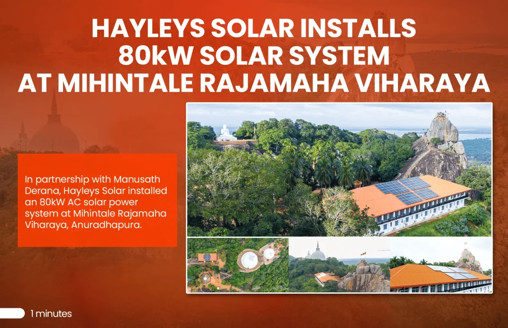 Hayleys Solar, Sri Lanka’s No. 1 solar solutions provider, partnered with Manusath Derana to install an 80kW AC solar power system at Mihintale Rajamaha Viharaya, Anuradhapura. Initiated through the generous efforts of Ms. Kumuduni Abeysiriwardena together with other donors, this project supports the temple’s energy requirements with a sustainable solution, contributing to environmental preservation while ensuring long-term cost efficiency.